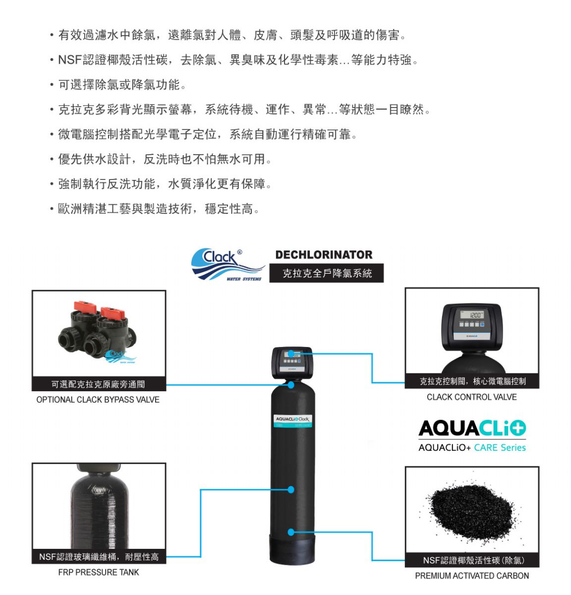 內容: AQUACLiO+ CARE 智慧高效降氯淨水系統,克拉克多彩光學控制閥搭配椰殼活性碳,可選擇除氯或降氯功能,有效過濾水中餘氯,遠離氯對人體、皮膚、頭髮及呼吸道的傷害 ✓. 有效過濾水中餘氯,遠離氯對人體、皮膚、頭髮及呼吸道的傷害。 ✓. NSF認證椰殼活性碳,去除氯、異臭味及化學性毒素…等能力特強。 ✓. 可選擇除氯或降氯功能。 ✓. 克拉克多彩背光顯示螢幕,系統待機、運作、異常…等狀態一目瞭然。 ✓. 微電腦控制搭配光學電子定位,系統自動運行精確可靠。 ✓. 優先供水設計,反洗時也不怕無水可用。 ✓. 強制執行反洗功能,水質淨化更有保障。 ✓. 歐洲精湛工藝與製造技術,穩定性高。