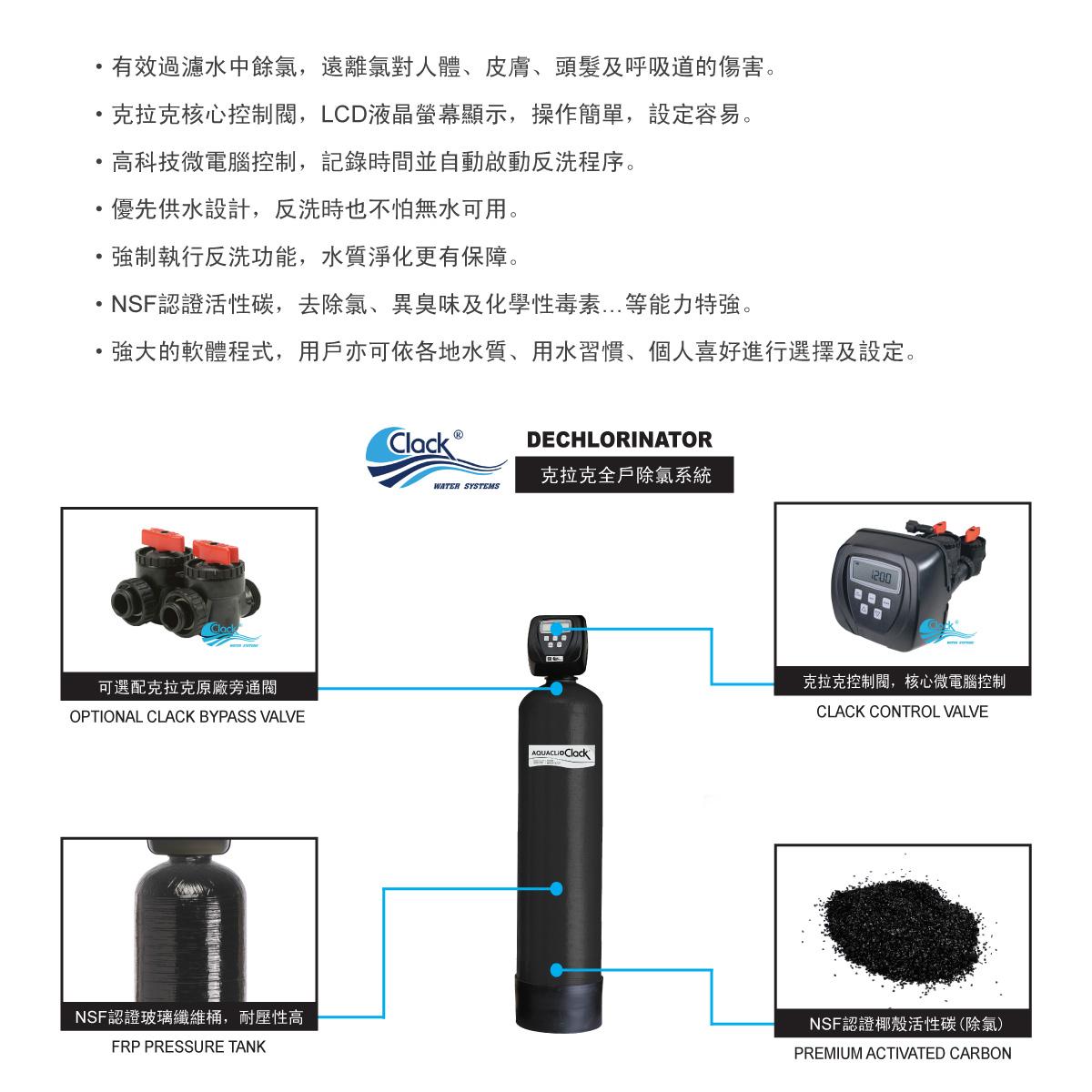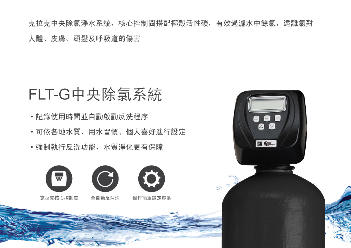 內容: 克拉克中央除氯淨水系統,核心控制閥搭配椰殼活性碳,有效過濾水中餘氯,遠離氯對人體、皮膚、頭髮及呼吸道的傷害 ✓. 有效過濾水中餘氯,遠離氯對人體、皮膚、頭髮及呼吸道的傷害。 ✓. 克拉克核心控制閥,LCD液晶螢幕顯示,操作簡單,設定容易。 ✓. 高科技微電腦控制,記錄時間並自動啟動反洗程序。 ✓. 優先供水設計,反洗時也不怕無水可用。 ✓. 強制執行反洗功能,水質淨化更有保障。 ✓. NSF認證活性碳,去除氯、異臭味及化學性毒素…等能力特強。 ✓. 強大的軟體程式,用戶亦可依各地水質、用水習慣、個人喜好進行選擇及設定。