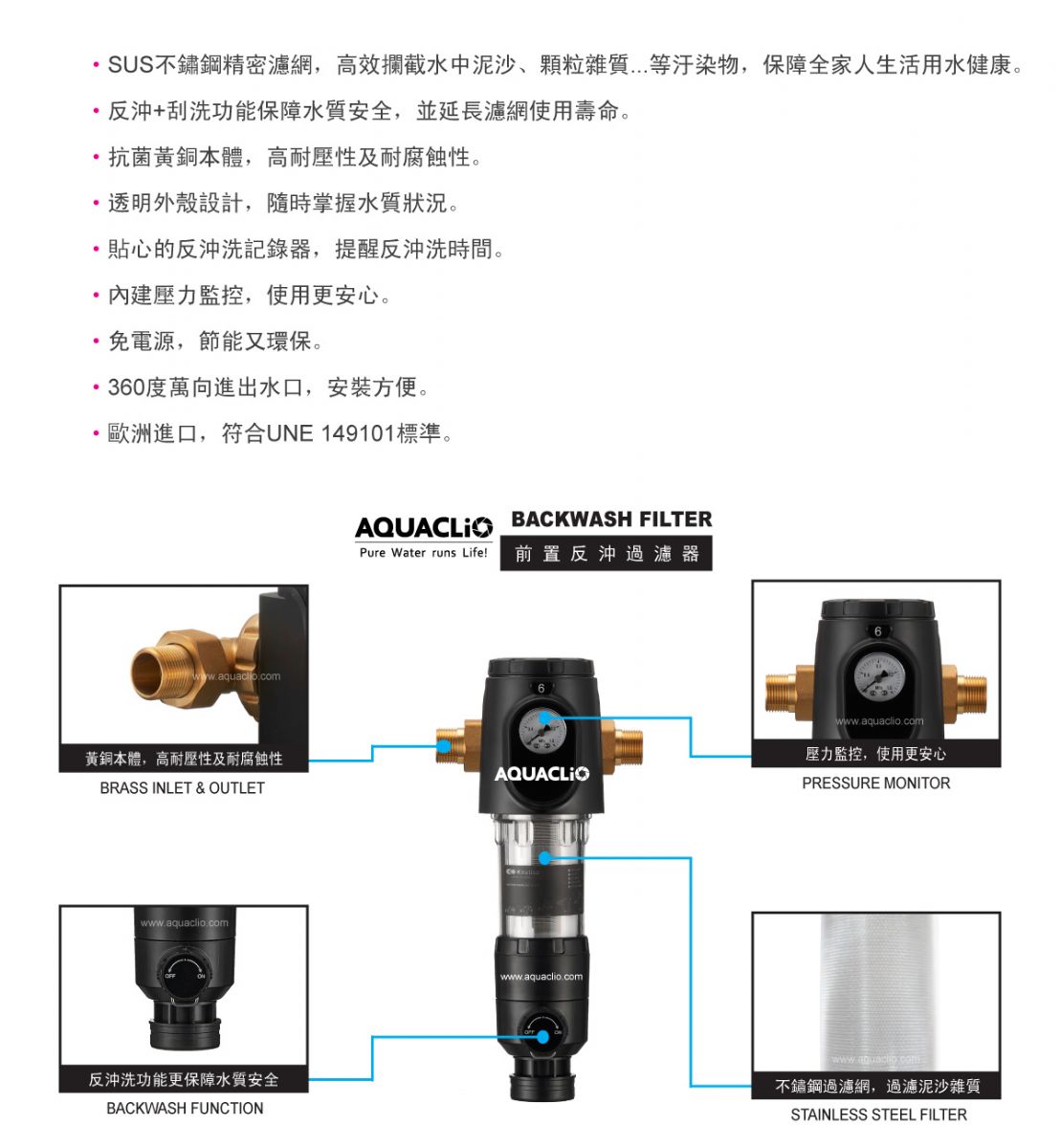 特色: • 不鏽鋼精密濾網,高效攔截水中泥沙、顆粒雜質 • 反沖+刮洗功能保障水質安全 • 抗菌黃銅本體,高耐壓性及耐腐蝕性 • 透明外殼設計,隨時掌握水質狀況 • 內建壓力監控,使用更安心