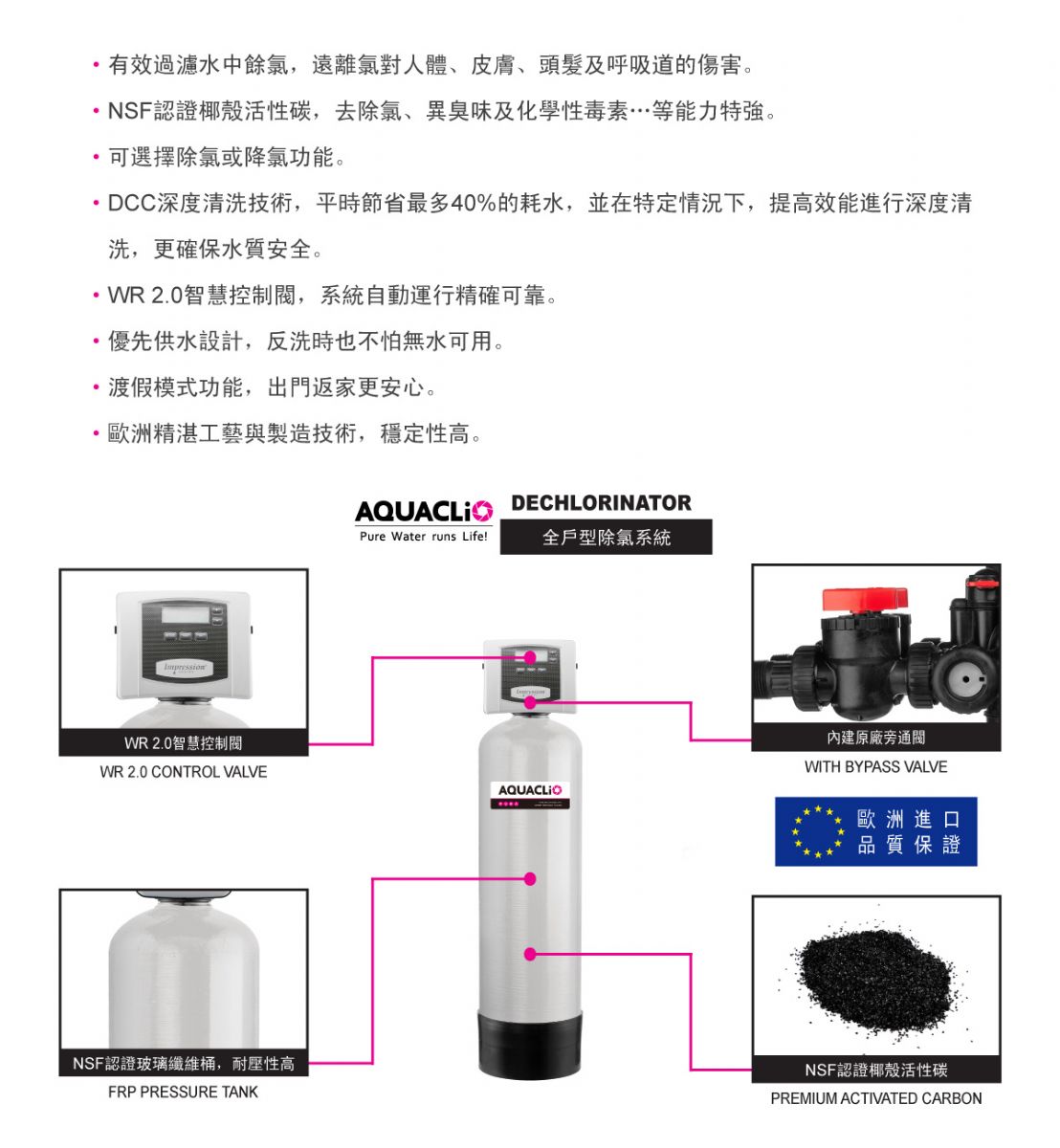 內容: AQUACLiO克麗歐晶鑽型中央降氯淨水系統,WR 2.0智慧控制閥搭配椰殼活性碳,可選擇除氯或降氯功能,有效過濾水中餘氯,遠離氯對人體、皮膚、頭髮及呼吸道的傷害 • 有效過濾水中餘氯,遠離氯對人體、皮膚、頭髮及呼吸道的傷害。 • NSF認證椰殼活性碳,去除氯、異臭味及化學性毒素…等能力特強。 • 可選擇除氯或降氯功能。 • DCC深度清洗技術,平時節省最多40%的耗水,並在特定情況下,提高效能進行深度清洗,更確保水質安全。 • WR 2.0智慧控制閥,系統自動運行精確可靠。 • 優先供水設計,反洗時也不怕無水可用。 • 渡假模式功能,出門返家更安心。 • 歐洲精湛工藝與製造技術,穩定性高。
