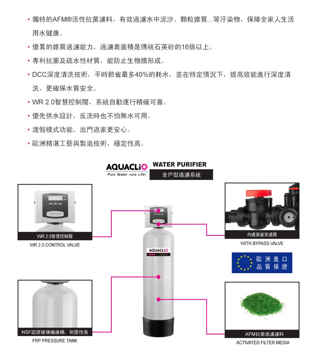 內容: AQUACLiO克麗歐晶鑽型抗菌雜質過濾系統,WR 2.0智慧控制閥搭配AFM®活性抗菌濾料,不但有效過濾水中泥沙、顆粒雜質...等汙染物,還能防止生物膜形成,保障全家人生活用水健康 • 獨特的AFM®活性抗菌濾料,有效過濾水中泥沙、顆粒雜質...等汙染物,保障全家人生活用水健康。 • 優異的雜質過濾能力,過濾表面積是傳統石英砂的16倍以上。 • 專利抗菌及疏水性材質,能防止生物膜形成。 • DCC深度清洗技術,平時節省最多40%的耗水,並在特定情況下,提高效能進行深度清洗,更確保水質安全。 • WR 2.0智慧控制閥,系統自動運行精確可靠。 • 優先供水設計,反洗時也不怕無水可用。 • 渡假模式功能,出門返家更安心。 • 歐洲精湛工藝與製造技術,穩定性高。