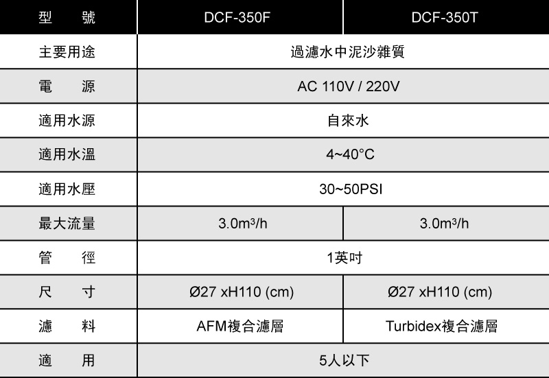 特色: • 有效過濾水中泥沙、顆粒雜質...等汙染物 • 專利抗菌及疏水性材質,防止生物膜形成 • DCC深度清洗技術,更確保水質安全 • NSF認證專利AFM®活性抗菌濾料 • 優先供水設計,反洗時也不怕無水可用