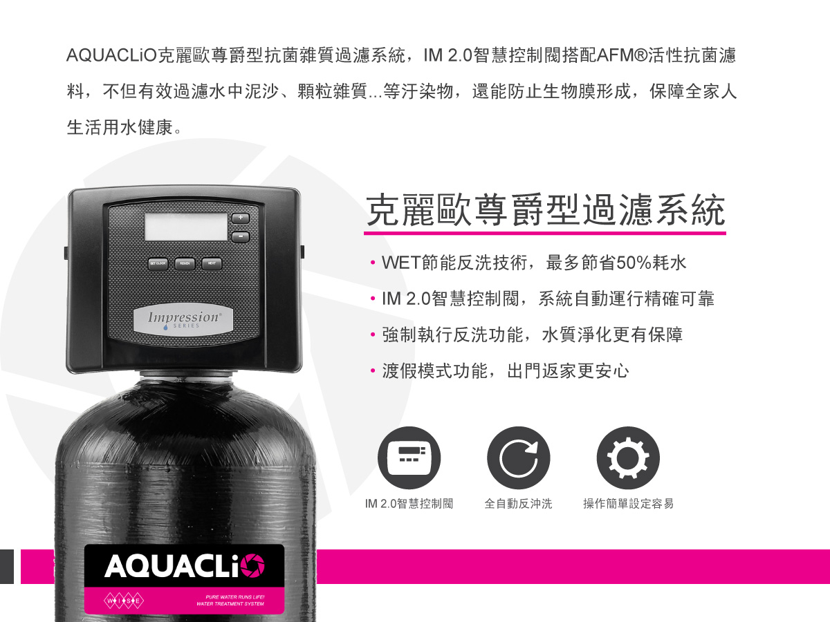 內容: AQUACLiO克麗歐尊爵型抗菌雜質過濾系統,IM 2.0智慧控制閥搭配AFM®活性抗菌濾料,不但有效過濾水中泥沙、顆粒雜質...等汙染物,還能防止生物膜形成,保障全家人生活用水健康 • 獨特的AFM®活性抗菌濾料,有效過濾水中泥沙、顆粒雜質...等汙染物,保障全家人生活用水健康。 • 優異的雜質過濾能力,過濾表面積是傳統石英砂的16倍以上。 • 專利抗菌及疏水性材質,能防止生物膜形成。 • WET節能反洗技術能動態調整耗水,最多可減少50%不必要的浪費。 • IM 2.0智慧控制閥,系統自動運行精確可靠。 • 優先供水設計,反洗時也不怕無水可用。 • 渡假模式功能,出門返家更安心。 • 歐洲精湛工藝與製造技術,穩定性高。