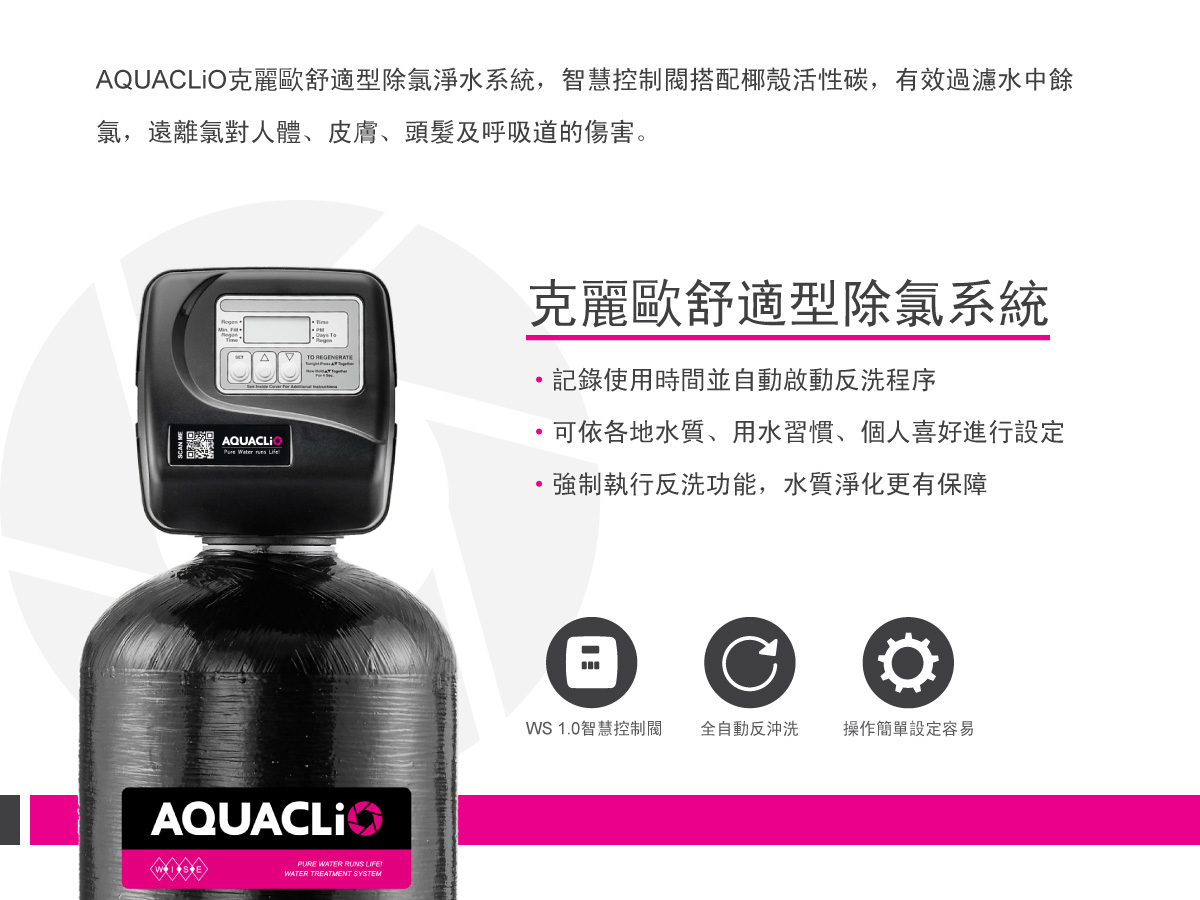 內容: AQUACLiO克麗歐舒適型除氯淨水系統,智慧控制閥搭配椰殼活性碳,有效過濾水中餘氯,遠離氯對人體、皮膚、頭髮及呼吸道的傷害 •有效過濾水中餘氯,遠離氯對人體、皮膚、頭髮及呼吸道的傷害。 •NSF認證活性碳,去除氯、異臭味及化學性毒素…等能力特強。 •智慧控制閥,LCD液晶螢幕顯示,操作簡單,設定容易。 •高科技微電腦控制,記錄時間並自動啟動反洗程序。 •優先供水設計,反洗時也不怕無水可用。 •強制執行反洗功能,水質淨化更有保障。 •強大的軟體程式,用戶亦可依各地水質、用水習慣、個人喜好進行選擇及設定。