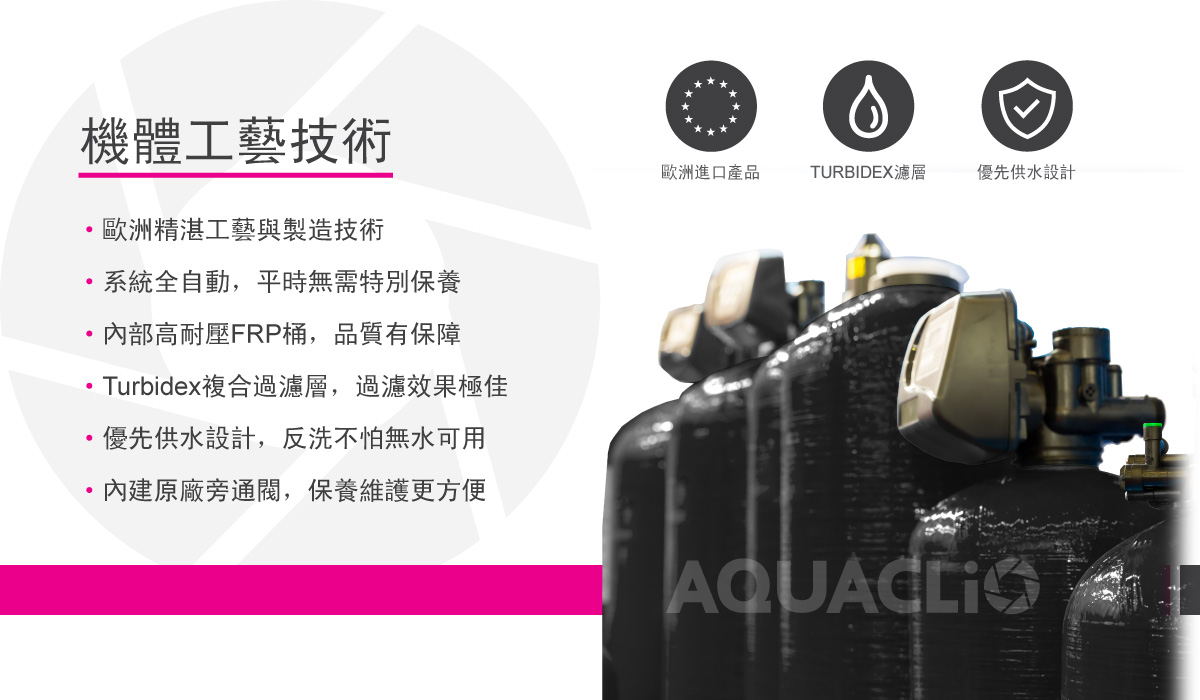 內容: AQUACLiO克麗歐舒適型雜質過濾系統,智慧控制閥搭配獨特的Turbidex濾料,有效過濾水中泥沙、顆粒雜質...等汙染物,保障全家人生活用水健康 •獨特的Turbidex濾料,有效過濾水中泥沙、顆粒雜質...等汙染物,保障全家人生活用水健康。 • 優異的雜質過濾能力是傳統石英砂的2.8倍。 • 智慧控制閥,LCD液晶螢幕顯示,操作簡單,設定容易。 • 高科技微電腦控制,記錄時間並自動啟動反洗程序。 • 優先供水設計,反洗時也不怕無水可用。 • 強制執行反洗功能,水質淨化更有保障。 • 強大的軟體程式,用戶亦可依各地水質、用水習慣、個人喜好進行選擇及設定。