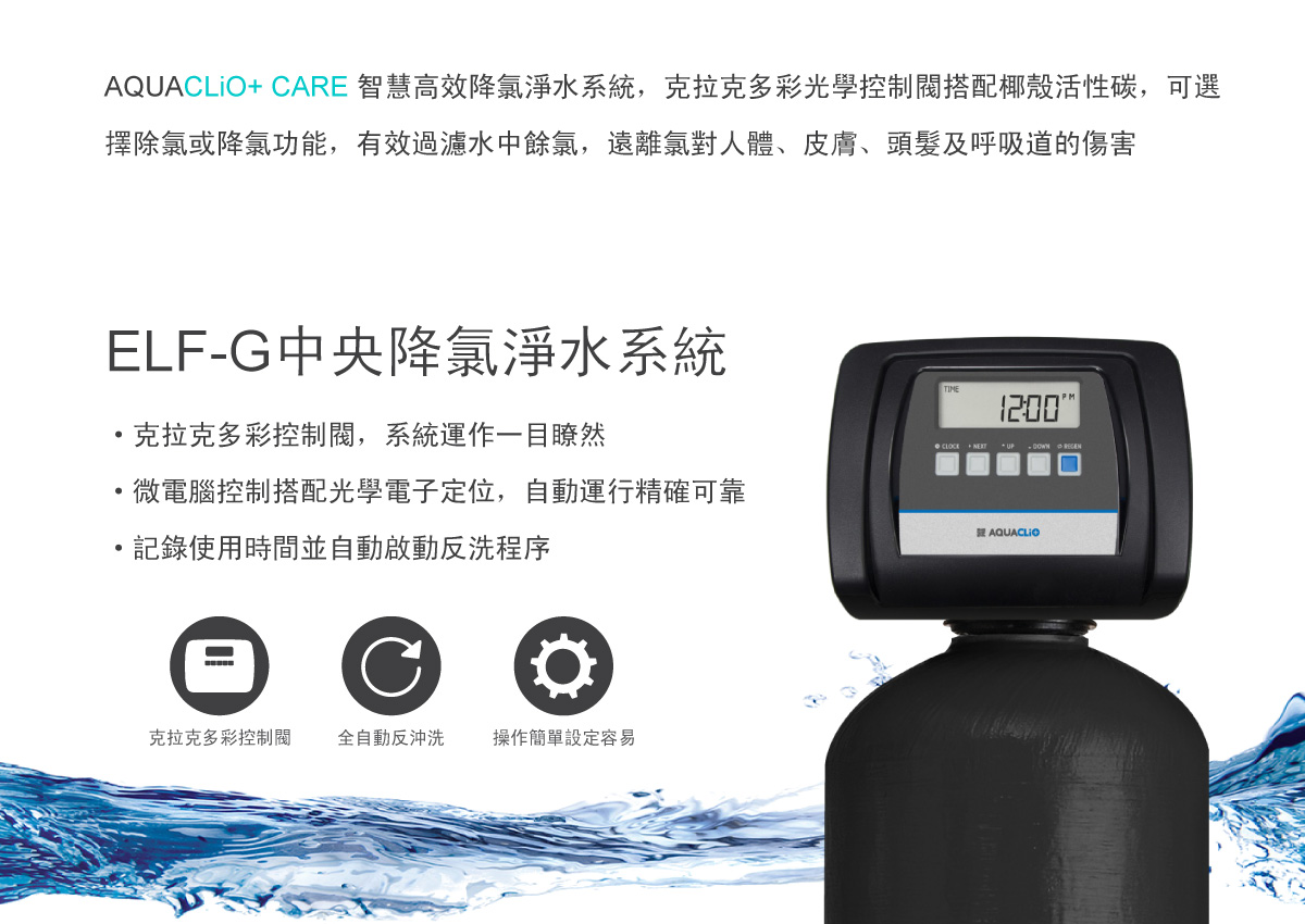 內容: AQUACLiO+ CARE 智慧高效降氯淨水系統,克拉克多彩光學控制閥搭配椰殼活性碳,可選擇除氯或降氯功能,有效過濾水中餘氯,遠離氯對人體、皮膚、頭髮及呼吸道的傷害 ✓. 有效過濾水中餘氯,遠離氯對人體、皮膚、頭髮及呼吸道的傷害。 ✓. NSF認證椰殼活性碳,去除氯、異臭味及化學性毒素…等能力特強。 ✓. 可選擇除氯或降氯功能。 ✓. 克拉克多彩背光顯示螢幕,系統待機、運作、異常…等狀態一目瞭然。 ✓. 微電腦控制搭配光學電子定位,系統自動運行精確可靠。 ✓. 優先供水設計,反洗時也不怕無水可用。 ✓. 強制執行反洗功能,水質淨化更有保障。 ✓. 歐洲精湛工藝與製造技術,穩定性高。
