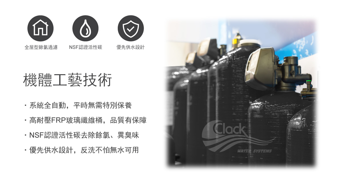 內容: 克拉克中央除氯淨水系統,核心控制閥搭配椰殼活性碳,有效過濾水中餘氯,遠離氯對人體、皮膚、頭髮及呼吸道的傷害 ✓. 有效過濾水中餘氯,遠離氯對人體、皮膚、頭髮及呼吸道的傷害。 ✓. 克拉克核心控制閥,LCD液晶螢幕顯示,操作簡單,設定容易。 ✓. 高科技微電腦控制,記錄時間並自動啟動反洗程序。 ✓. 優先供水設計,反洗時也不怕無水可用。 ✓. 強制執行反洗功能,水質淨化更有保障。 ✓. NSF認證活性碳,去除氯、異臭味及化學性毒素…等能力特強。 ✓. 強大的軟體程式,用戶亦可依各地水質、用水習慣、個人喜好進行選擇及設定。
