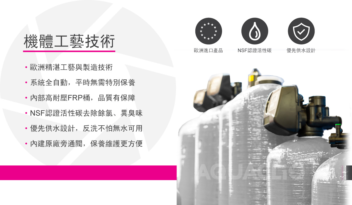 內容: AQUACLiO克麗歐晶鑽型中央降氯淨水系統,WR 2.0智慧控制閥搭配椰殼活性碳,可選擇除氯或降氯功能,有效過濾水中餘氯,遠離氯對人體、皮膚、頭髮及呼吸道的傷害 • 有效過濾水中餘氯,遠離氯對人體、皮膚、頭髮及呼吸道的傷害。 • NSF認證椰殼活性碳,去除氯、異臭味及化學性毒素…等能力特強。 • 可選擇除氯或降氯功能。 • DCC深度清洗技術,平時節省最多40%的耗水,並在特定情況下,提高效能進行深度清洗,更確保水質安全。 • WR 2.0智慧控制閥,系統自動運行精確可靠。 • 優先供水設計,反洗時也不怕無水可用。 • 渡假模式功能,出門返家更安心。 • 歐洲精湛工藝與製造技術,穩定性高。