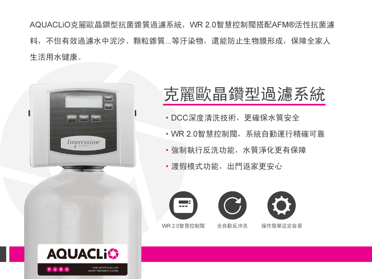 內容: AQUACLiO克麗歐晶鑽型抗菌雜質過濾系統,WR 2.0智慧控制閥搭配AFM®活性抗菌濾料,不但有效過濾水中泥沙、顆粒雜質...等汙染物,還能防止生物膜形成,保障全家人生活用水健康 • 獨特的AFM®活性抗菌濾料,有效過濾水中泥沙、顆粒雜質...等汙染物,保障全家人生活用水健康。 • 優異的雜質過濾能力,過濾表面積是傳統石英砂的16倍以上。 • 專利抗菌及疏水性材質,能防止生物膜形成。 • DCC深度清洗技術,平時節省最多40%的耗水,並在特定情況下,提高效能進行深度清洗,更確保水質安全。 • WR 2.0智慧控制閥,系統自動運行精確可靠。 • 優先供水設計,反洗時也不怕無水可用。 • 渡假模式功能,出門返家更安心。 • 歐洲精湛工藝與製造技術,穩定性高。