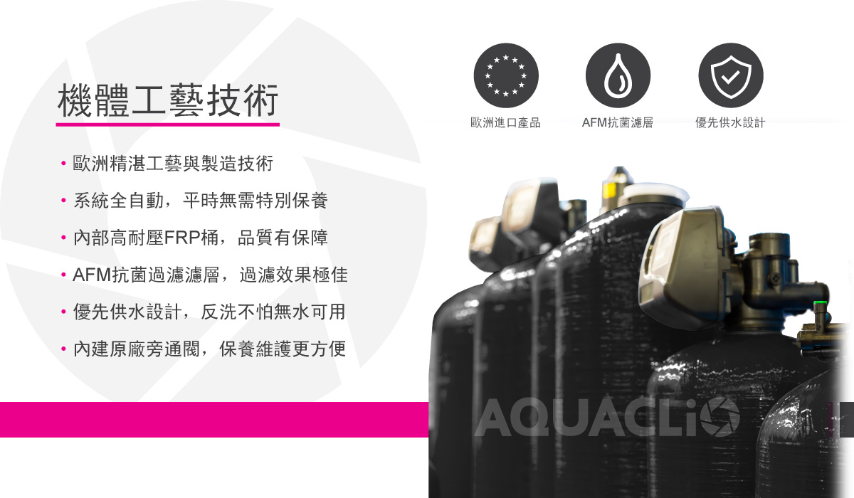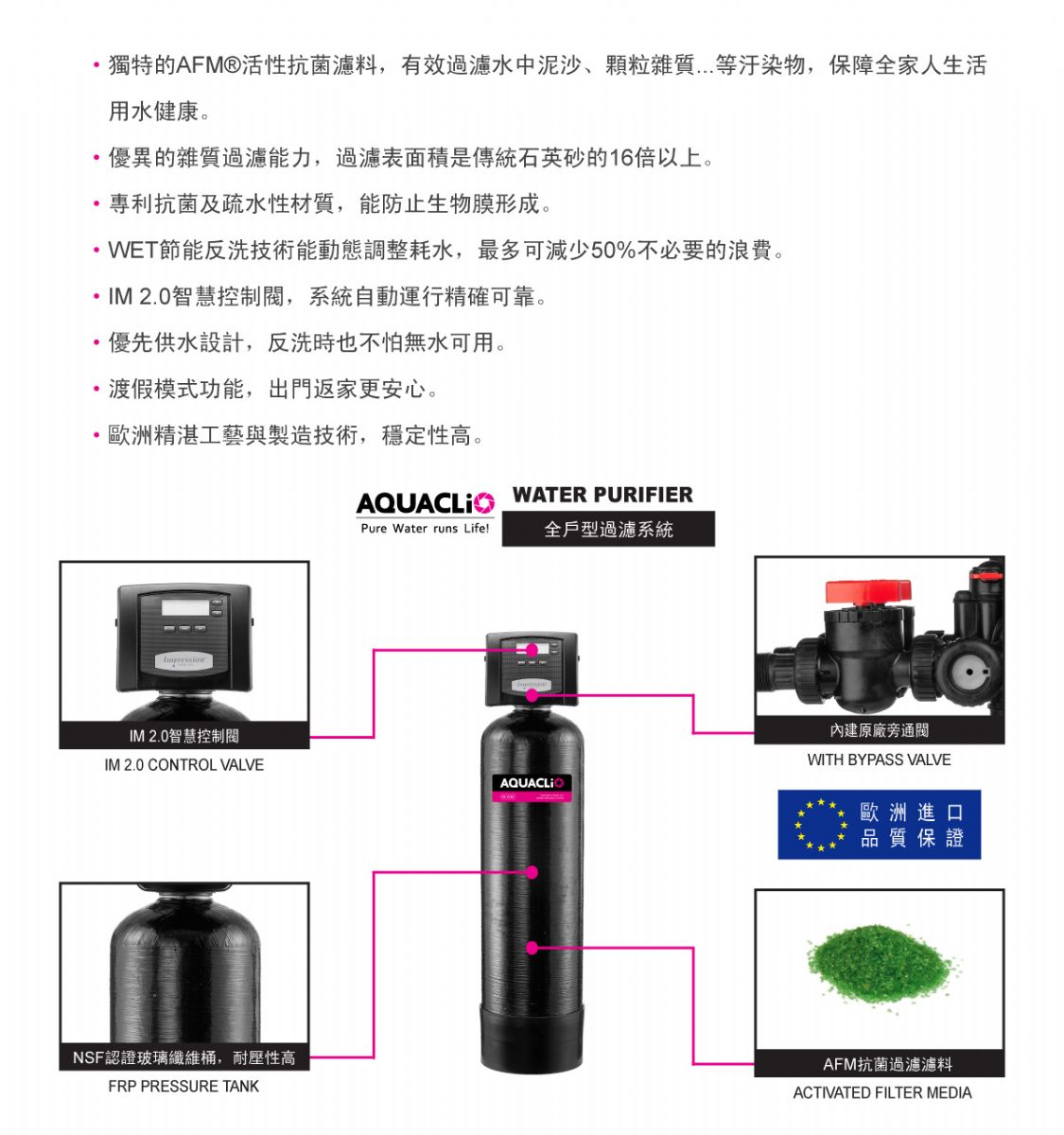 內容: AQUACLiO克麗歐尊爵型抗菌雜質過濾系統,IM 2.0智慧控制閥搭配AFM®活性抗菌濾料,不但有效過濾水中泥沙、顆粒雜質...等汙染物,還能防止生物膜形成,保障全家人生活用水健康 • 獨特的AFM®活性抗菌濾料,有效過濾水中泥沙、顆粒雜質...等汙染物,保障全家人生活用水健康。 • 優異的雜質過濾能力,過濾表面積是傳統石英砂的16倍以上。 • 專利抗菌及疏水性材質,能防止生物膜形成。 • WET節能反洗技術能動態調整耗水,最多可減少50%不必要的浪費。 • IM 2.0智慧控制閥,系統自動運行精確可靠。 • 優先供水設計,反洗時也不怕無水可用。 • 渡假模式功能,出門返家更安心。 • 歐洲精湛工藝與製造技術,穩定性高。