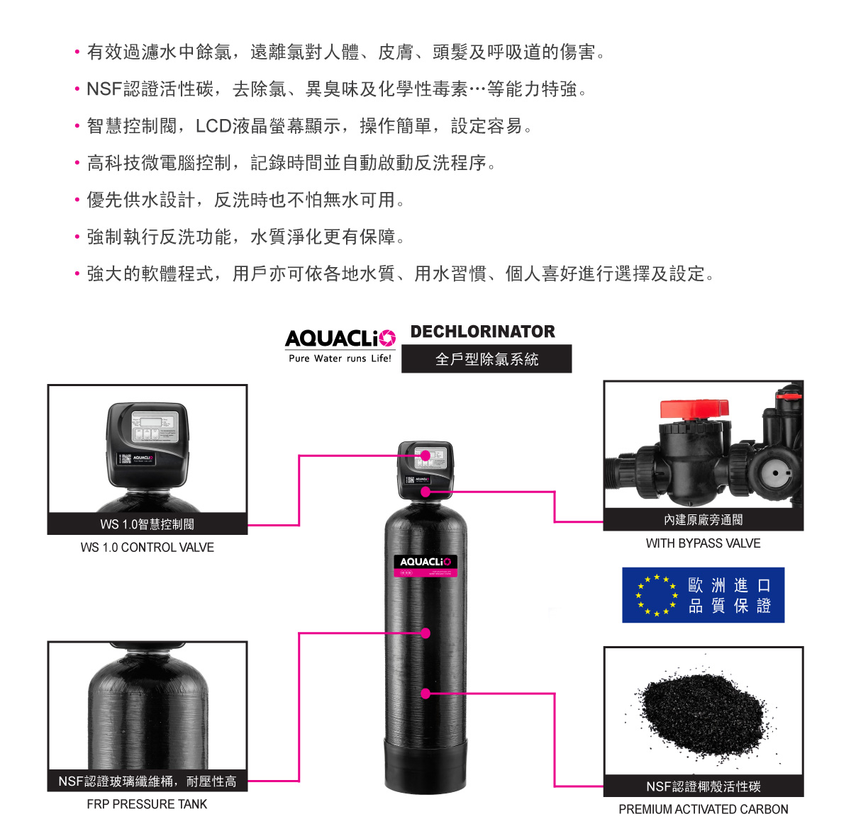 內容: AQUACLiO克麗歐舒適型除氯淨水系統,智慧控制閥搭配椰殼活性碳,有效過濾水中餘氯,遠離氯對人體、皮膚、頭髮及呼吸道的傷害 •有效過濾水中餘氯,遠離氯對人體、皮膚、頭髮及呼吸道的傷害。 •NSF認證活性碳,去除氯、異臭味及化學性毒素…等能力特強。 •智慧控制閥,LCD液晶螢幕顯示,操作簡單,設定容易。 •高科技微電腦控制,記錄時間並自動啟動反洗程序。 •優先供水設計,反洗時也不怕無水可用。 •強制執行反洗功能,水質淨化更有保障。 •強大的軟體程式,用戶亦可依各地水質、用水習慣、個人喜好進行選擇及設定。