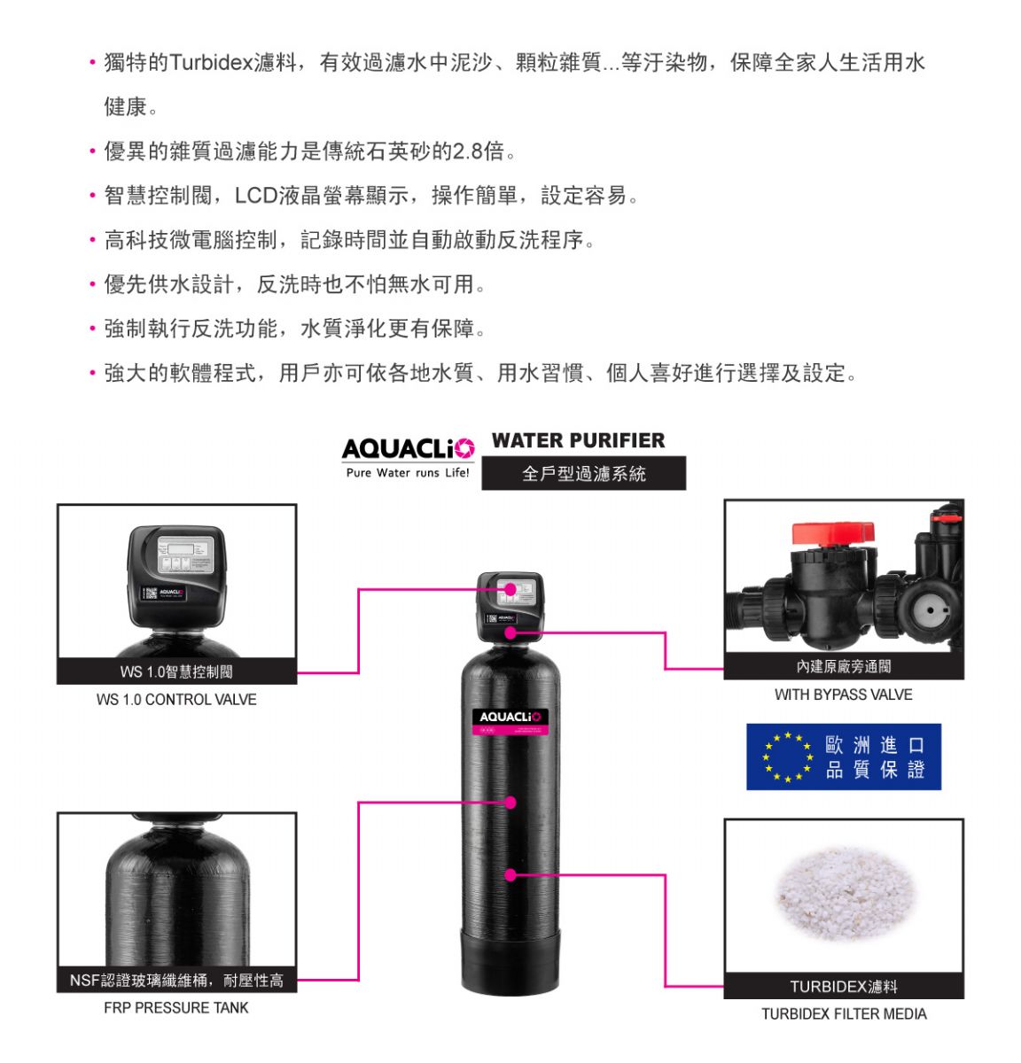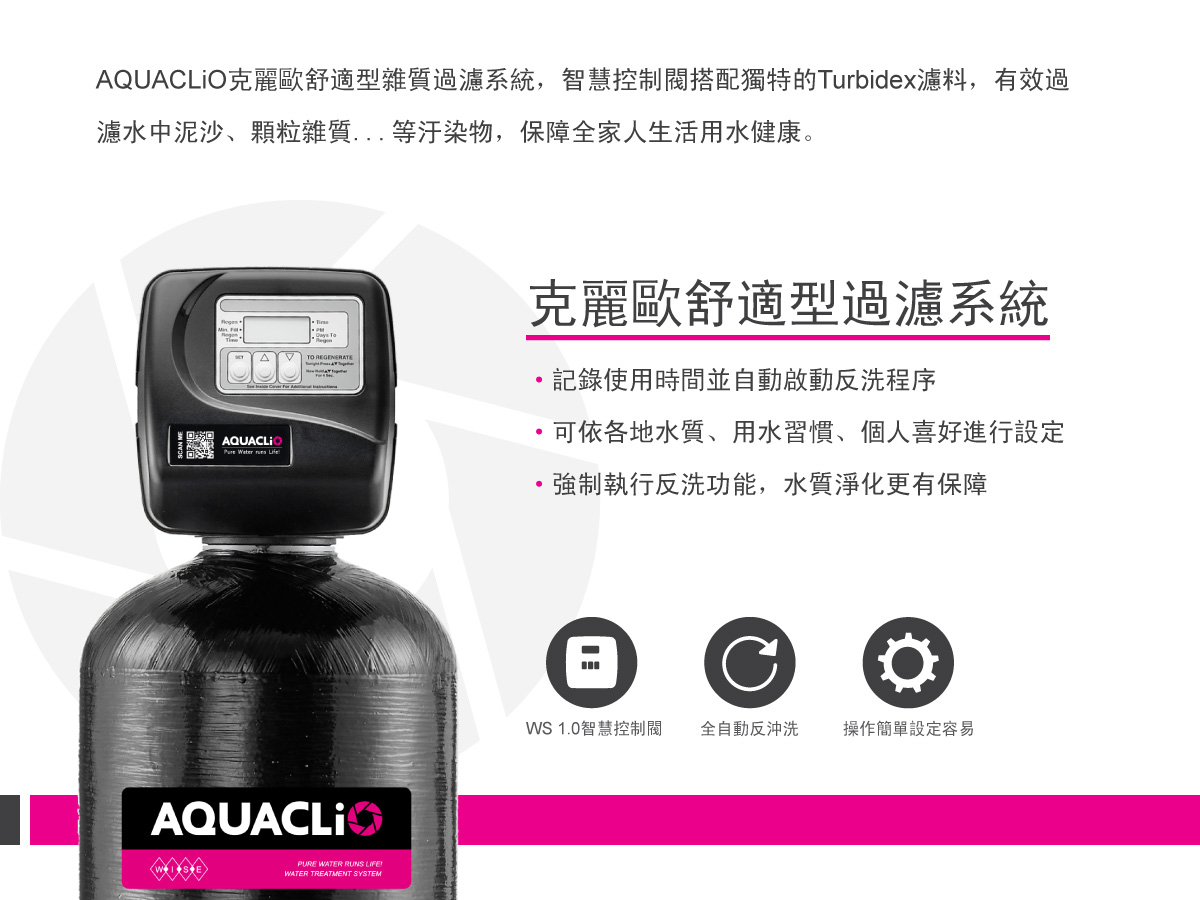 內容: AQUACLiO克麗歐舒適型雜質過濾系統,智慧控制閥搭配獨特的Turbidex濾料,有效過濾水中泥沙、顆粒雜質...等汙染物,保障全家人生活用水健康 •獨特的Turbidex濾料,有效過濾水中泥沙、顆粒雜質...等汙染物,保障全家人生活用水健康。 • 優異的雜質過濾能力是傳統石英砂的2.8倍。 • 智慧控制閥,LCD液晶螢幕顯示,操作簡單,設定容易。 • 高科技微電腦控制,記錄時間並自動啟動反洗程序。 • 優先供水設計,反洗時也不怕無水可用。 • 強制執行反洗功能,水質淨化更有保障。 • 強大的軟體程式,用戶亦可依各地水質、用水習慣、個人喜好進行選擇及設定。