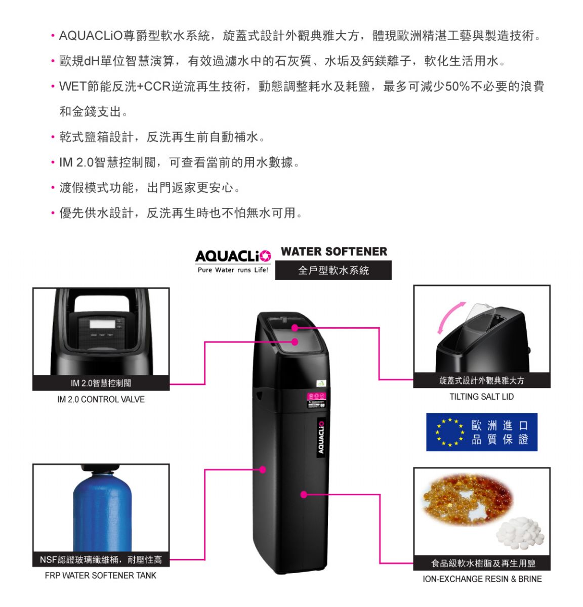 內容: AQUACLiO克麗歐尊爵型軟水系統,過濾水中的石灰質、水垢及鈣鎂離子。旋蓋式設計外觀典雅大方,體現歐洲精湛工藝與製造技術。WET節能反洗技術,動態調整耗水及耗鹽,最多可減少50%不必要的浪費和金錢支出 • AQUACLiO尊爵型軟水系統,旋蓋式設計外觀典雅大方,體現歐洲精湛工藝與製造技術。 • 歐規dH單位智慧演算,有效過濾水中的石灰質、水垢及鈣鎂離子,軟化生活用水。 • WET節能反洗+CCR逆流再生技術,動態調整耗水及耗鹽,最多可減少50%不必要的浪費和金錢支出。 • 乾式鹽箱設計,反洗再生前自動補水。 • IM 2.0智慧控制閥,可查看當前的用水數據。 • 渡假模式功能,出門返家更安心。 • 優先供水設計,反洗再生時也不怕無水可用。